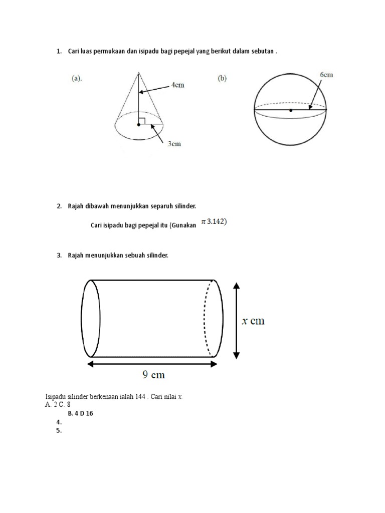 Untuk mencari luas permukaannnya kamu harus menghitung luas alas yang berbentuk lingkaran dan luas bidang lengkung yang mengerucut kemudian menjumlahkan keduanya. 6 3 1 luas permukaan bentuk tiga dimensi praktis berformat pt3 soalan 1.