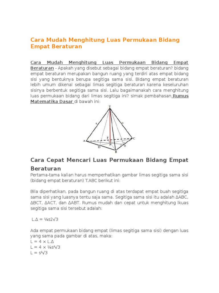 Luas permukaan limas luas alas 4 luas segitiga di bidang tegak luas s x s 4 1 2 x alas x tinggi luas 10 x 10 4 1 2 x 8 x 10 luas 100 4 40 luas 64 160 luas 224 cm2. Sama ada cara mencari luas permukaan dan isipadu memerlukan formula yang sama. Jumlah luas permukaan 2 πj2 2πjt 2 22 7 7 2 2 22 7 7 20 308 880 1188c. Rumus luas permukaan balok.