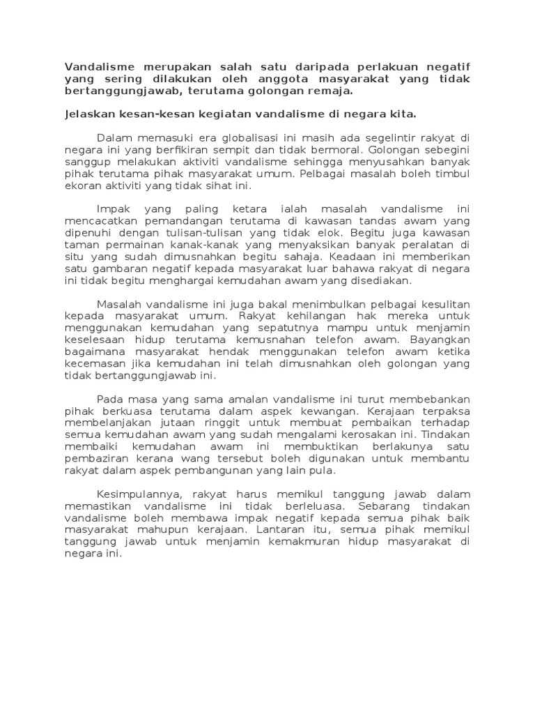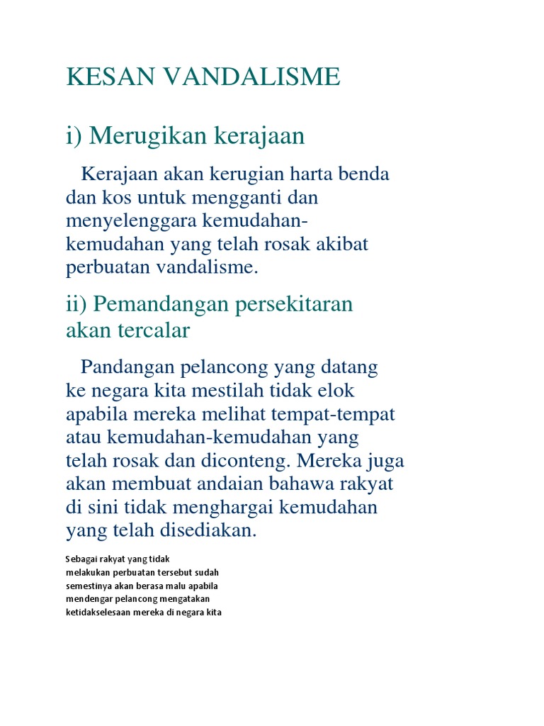 Punca berlakunya vandalisme. Salah satu faktor lain yang mendorong berlakunya vandalisme adalah disebabkan oleh sikap apati atau tidak peduli juga boleh dikatakan sebagai individualistik dan materialistik masyarakat sikap sesetengah masyarakat kini yang mementingkan soal kebendaan dan tidak mengambil peduli terhadap isu isu sosial menyebabkan masalah tersebut berlaku. Rakan sebaya merupakan komponen penting dalam membentuk keperibadian seseorang. Vandalisme dalam kalangan remaja. Golongan remaja biasanya lebih mudah meniru dan terpengaruh dengan rakan sebaya.