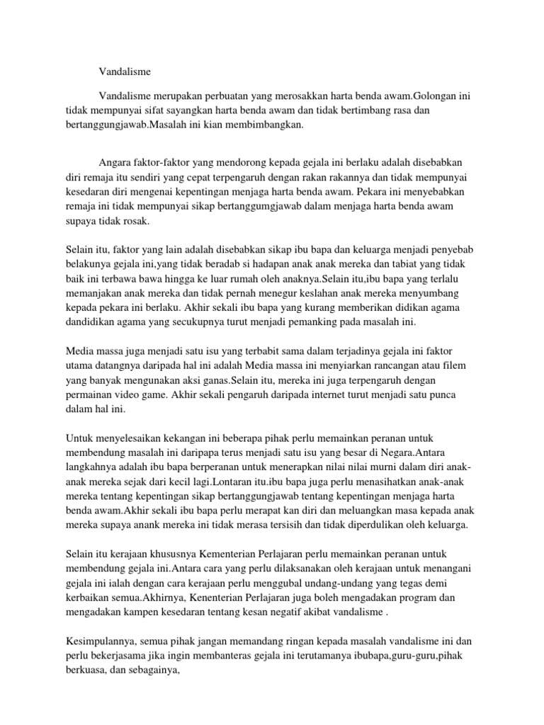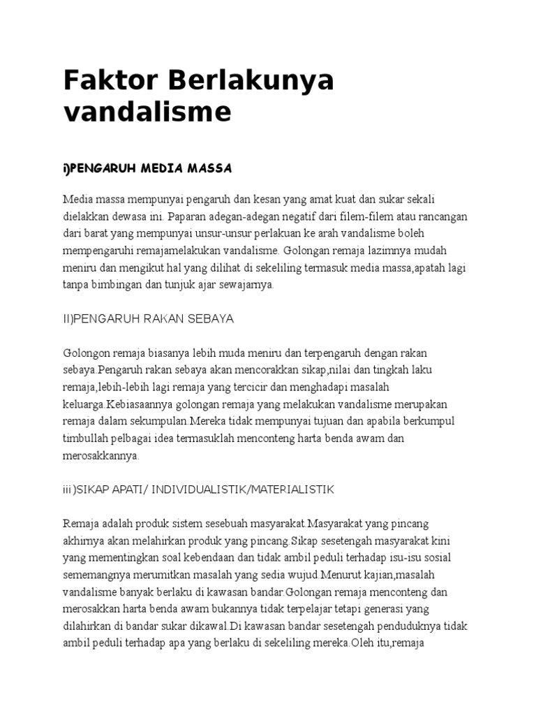 Ibu bapa patut dijadikan model dan mendidik anak anak mengamalkan amalan murni sejak kecil lagi. Gejala sosial sering kali dikaitkan dengan golongan remaja. Gejala vandelisme di negara kita semakin membimbangkan. Kamus oxford advanced learner s mentakrifkan vandalism sebagai willfully destroy or damage works of art public and private.