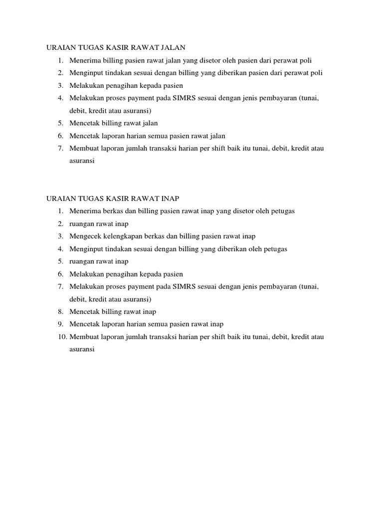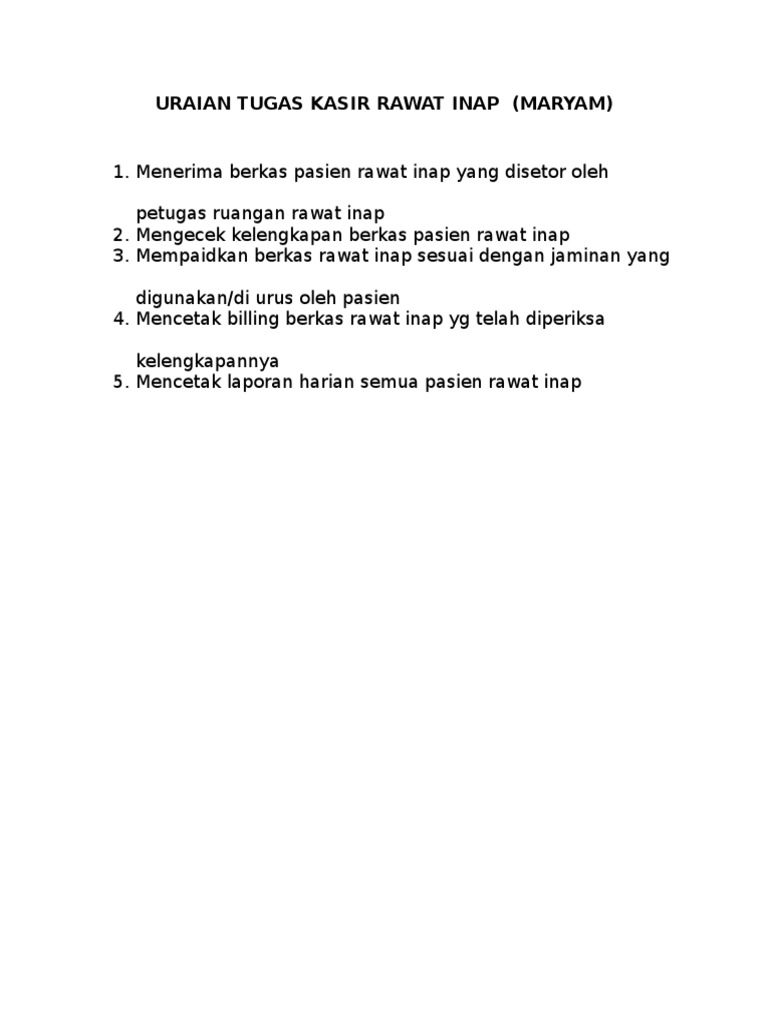 Uraian Tugas Kasir Rawat Inap